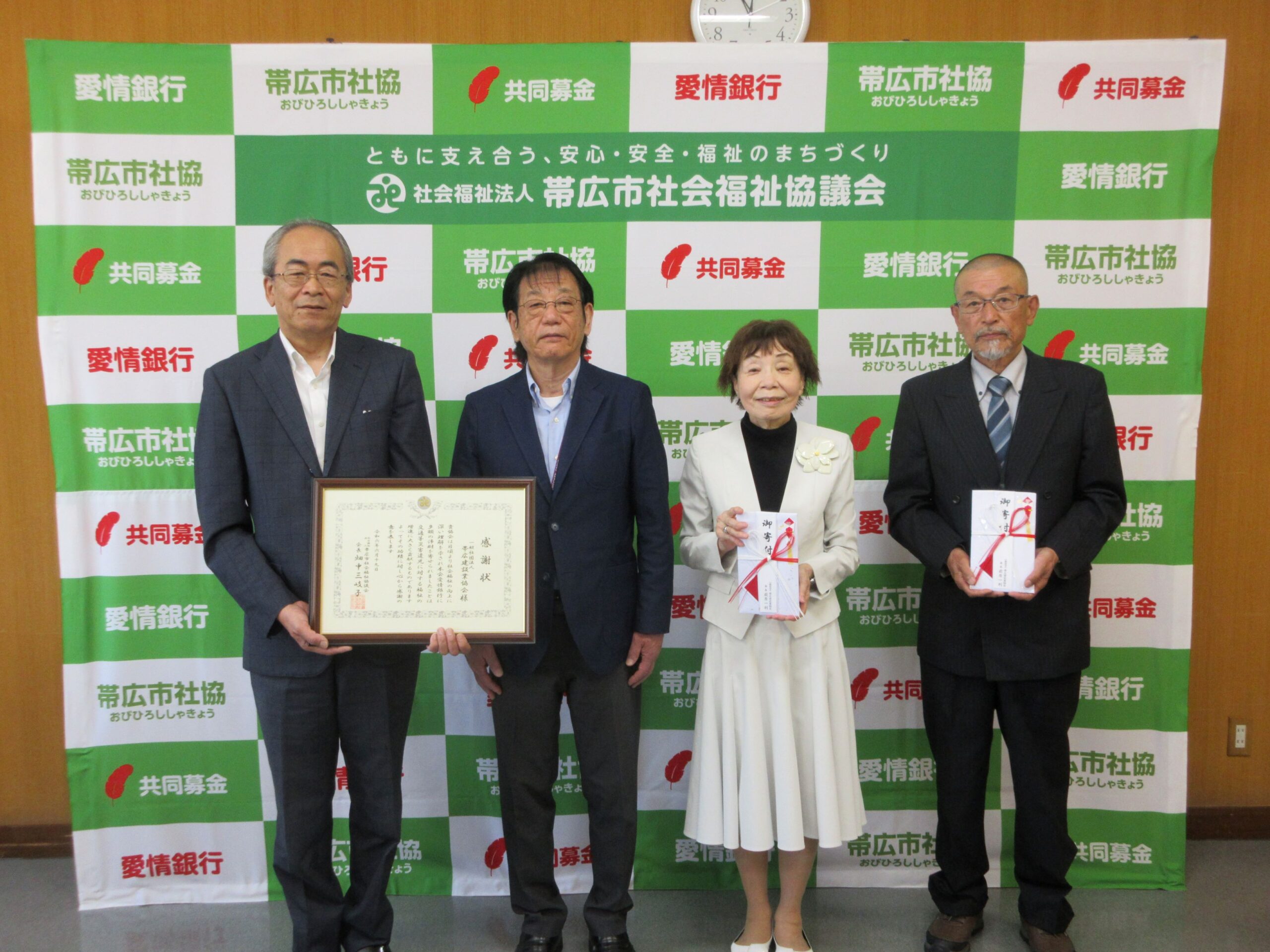 当協会を代表して交通安全委員長の村上誠が出席し、ご出席いただいた帯広市社会福祉協議会 畑中三岐子会長、北海道社会福祉協議会十勝地区事務所 小山眞作運営委員長に寄附金の贈呈をいたしました。